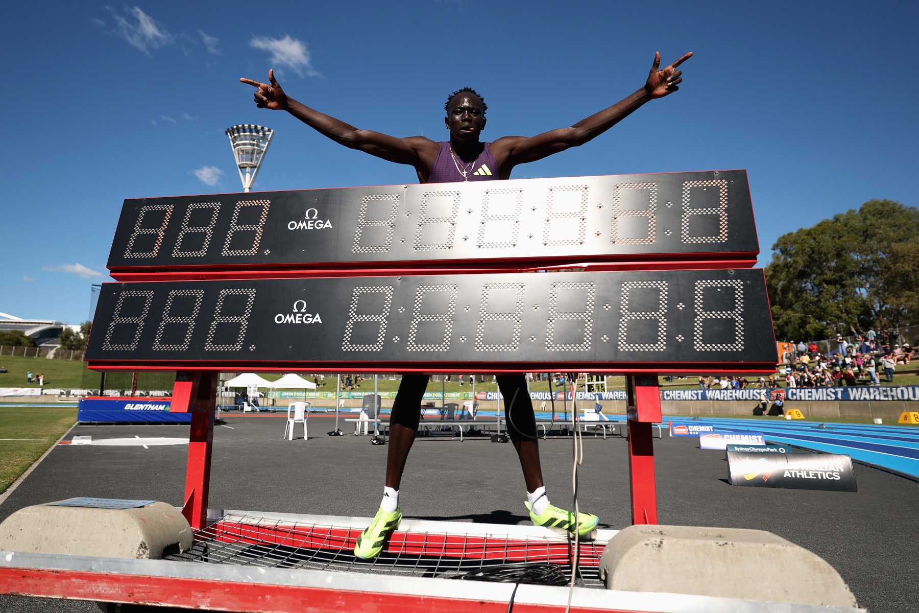SYDNEY, AUSTRALIA - APRIL 12: Gout Gout of Queensland poses with the clock after breaking the World Junior Record and Australian Record and a PB to win the Men's 200m final in 19.67 seconds during the 2026 Australian Athletics Championships at Sydney Olympic Park Athletic Centre on April 12, 2026 in Sydney, Australia. (Photo by Cameron Spencer/Getty Images)